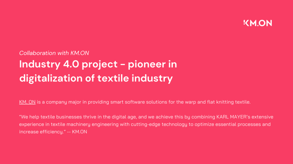 The collaboration with KM.ON was to promote the concept of Industry 4.0, the application and adoption of the cutting-edge technologies in the fashion and textile industry in bringing it to the next era; as well as to educate my students on such concept through practical learning. Industry 4.0 covers several emerging technologies such as Big Data, Cloud Technologies, Internet of Things (IoTs), Artificial Intelligence (AI) and other advanced production methods, and unlocks significant value across multiple areas of production network. Some studies report that Industry 4.0 technologies can help reduce 20% of cost and increase at least 15-30% of productivity for factories worldwide. Industry 4.0 has become a reality in the textile industry that the traditional work process, decision-making process and even the model of intensive use of labor will be completely changed. KARL MAYER Group, market leader of textile machinery industry has inaugurated digital technology company KM.ON.