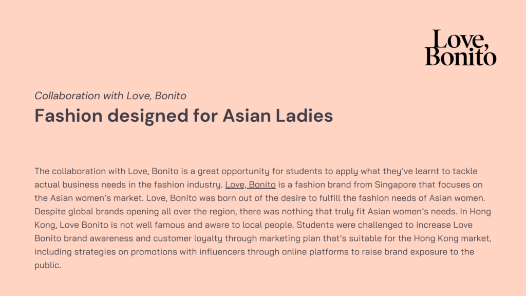 Students individually developed a full Marketing Promotional Campaign Ideation Plan at first, then were formed into groups to proceed with Marketing Promotional Campaign Launch Plan & Retro. They then competed to ideate and curate the most innovative Marketing Campaign to creatively promote Love, Bonito during Hong Kong’s Art Month in May, by conceptualising a Love, Bonito Trunk Show (outdoor) to promote the S/S Collection to drive maximum awareness and acquire new customer leads.